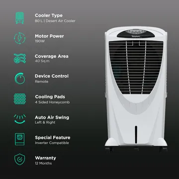 The Winter 80XLi is designed for maximum cooling in large areas up to 40 m². Featuring an 80L tank, quiet axial fan, patented design, and honeycomb cooling media, this model offers unmatched performance with remote control and user-friendly touch panel.